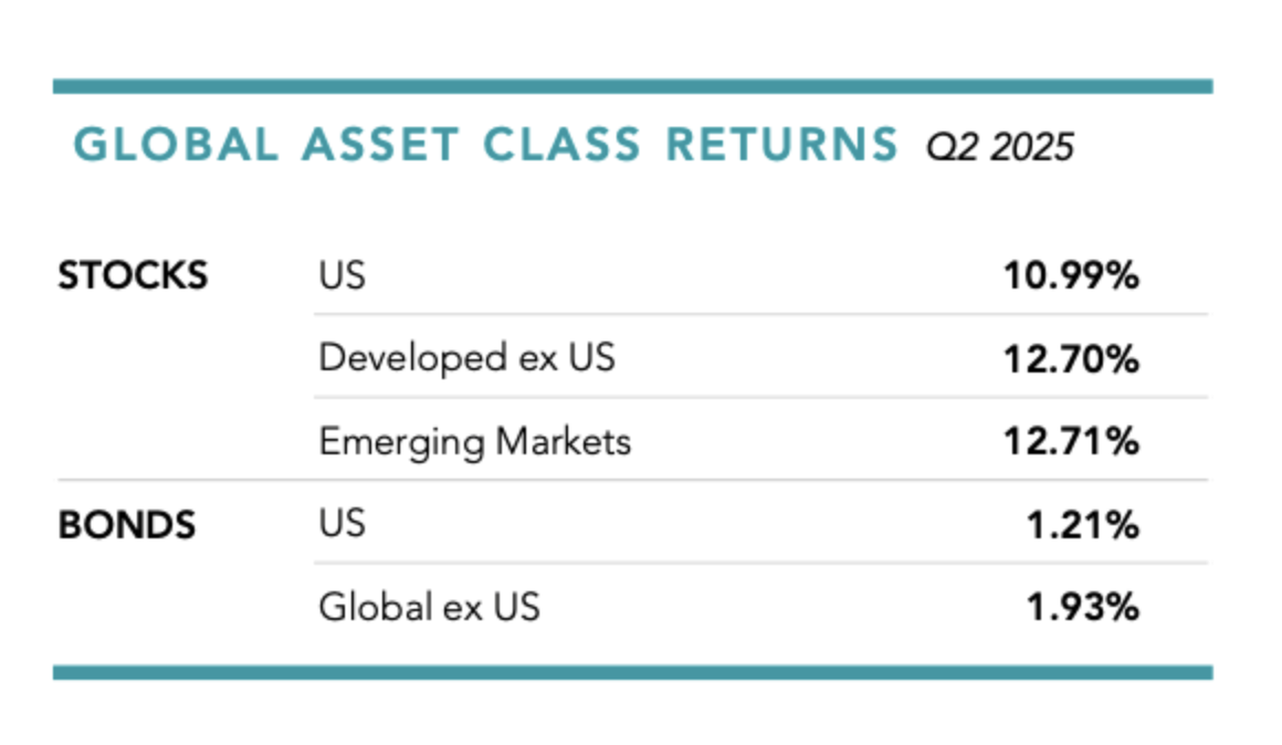 An important theme from Q1 2025 that continued through Q2 2025 was the outperformance of international vs US markets. I just want to emphasize the importance of sticking to a diversified allocation even when there are times that certain components of your portfolio are underperforming vs other indexes. Due to the very nature of diversified portfolios, this will always be the case and hopefully, as an insightful investor, you understand that it’s times like these where the benefit of discipline can reward a long term perspective. When you look at the outperformance of international markets over U.S. markets year-to-date, this concept really stands out.